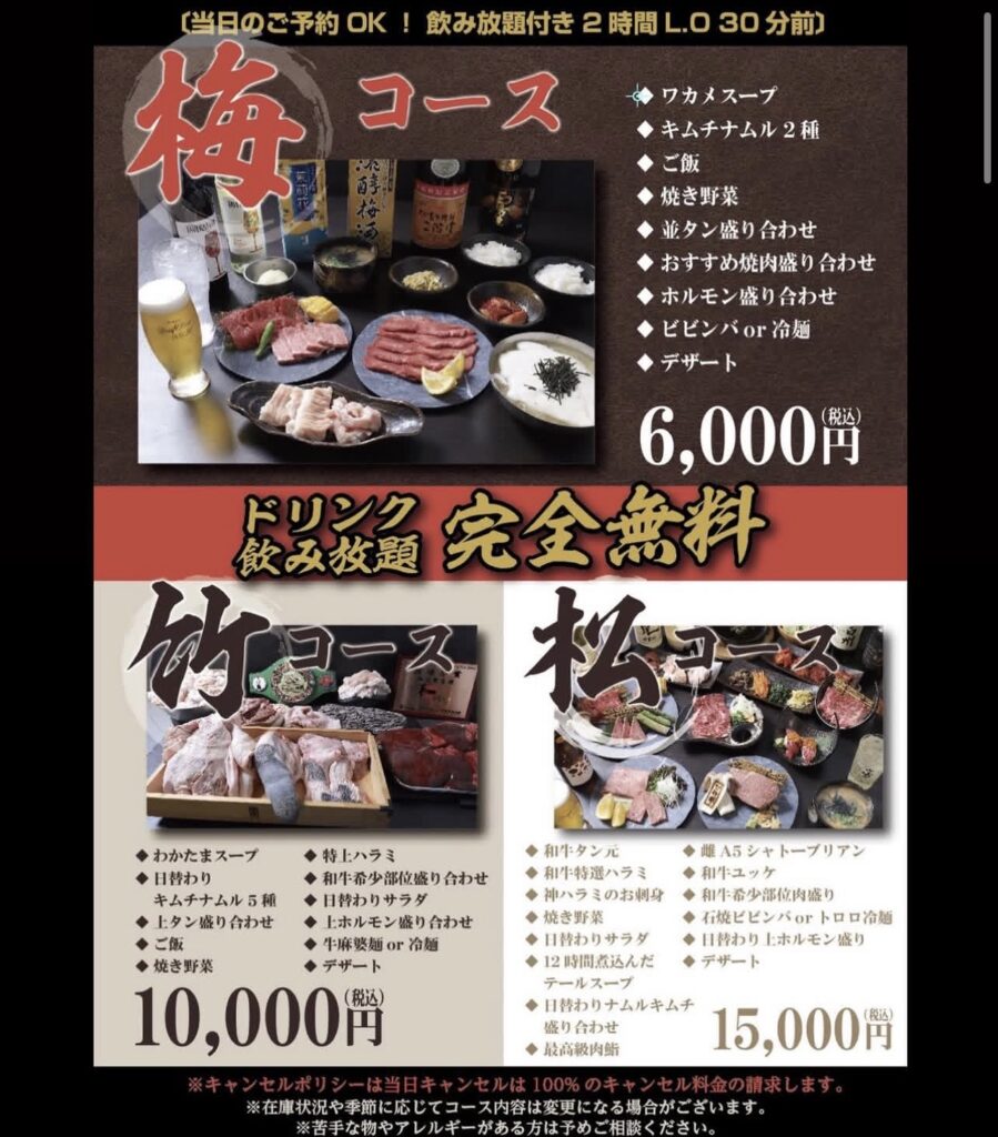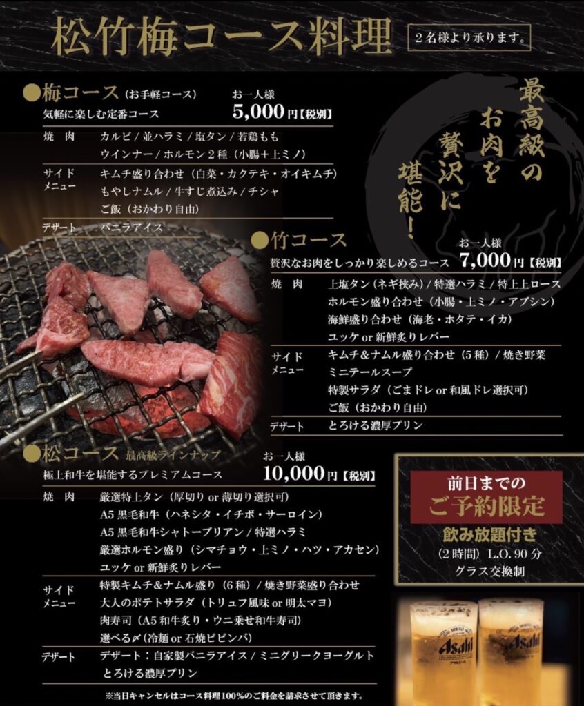 焼肉鈴輝では、アラカルトメニューに加え、前日までのご予約限定でお楽しみいただけるコース料理をご用意しております。